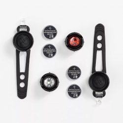 Le kit comprend : Phare avant Glo, éclairage arrière Ember, et 2 sangles en silicone